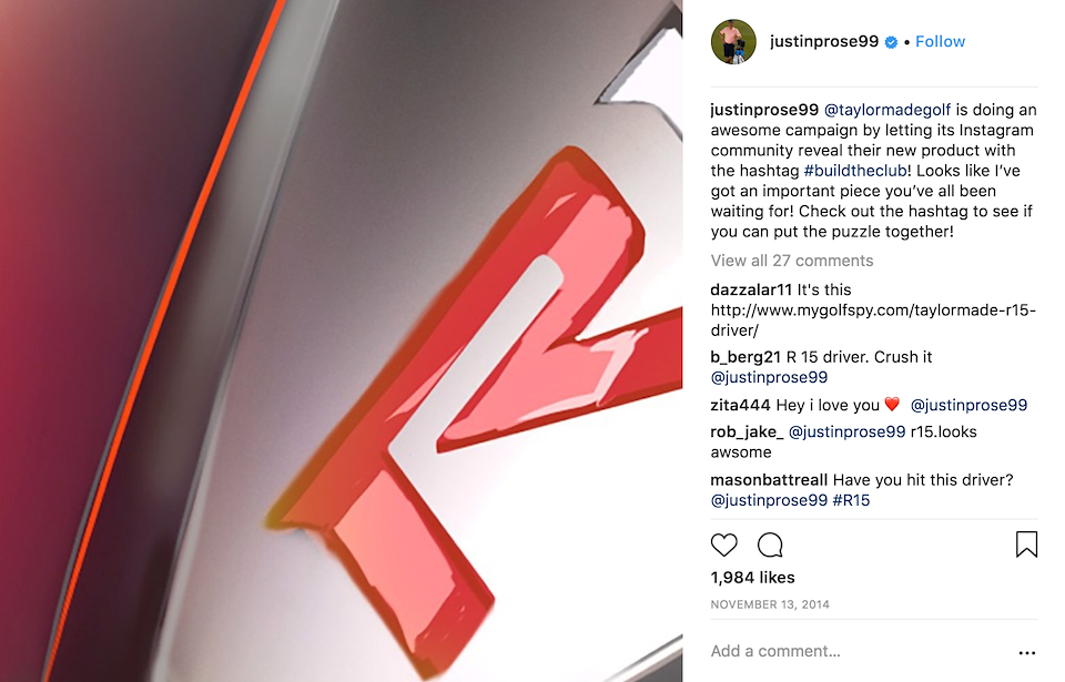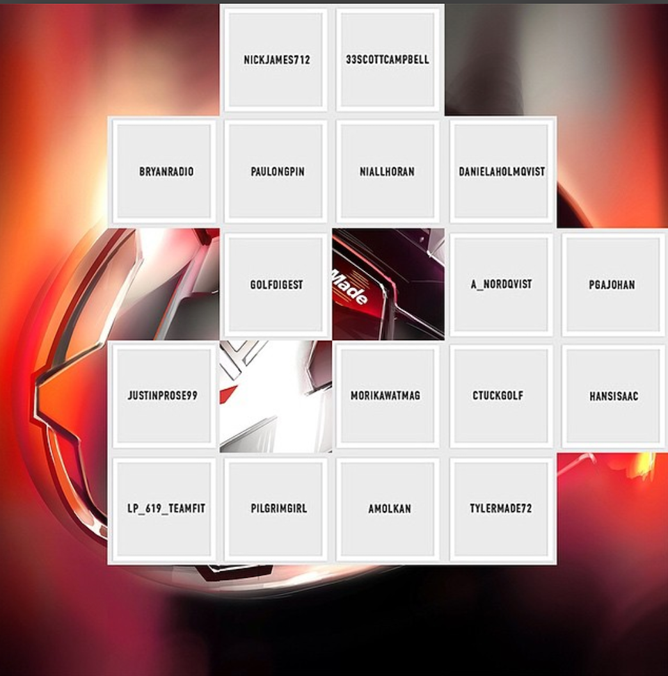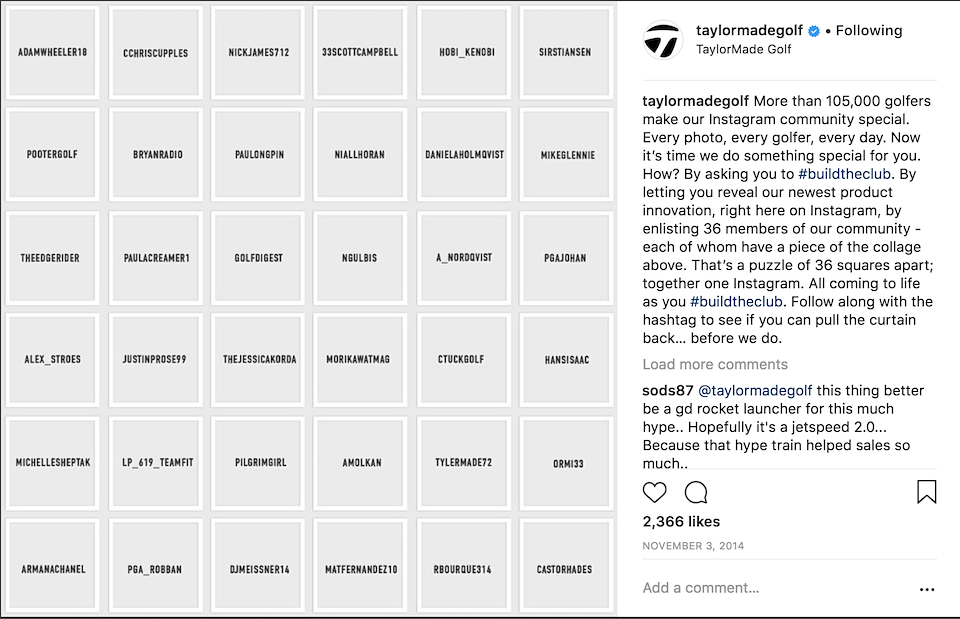 The goal was to create a low-budget campaign capable of rewarding, engaging and driving positive conversation with our loyal fans on one channel by incorporating them into the product reveal, by way of an unprecedented execution. To “unveil” the R15 driver, we created an Instagram campaign called #buildtheclub in which we cut artwork of the new product into 36 different squares. Over two weeks, we strategically distributed (using Instagram’s direct message function) the images to our superfans; our largest media partner on the channel (@golfdigest); and our athletes (5 professional golfers) to share on their feeds.