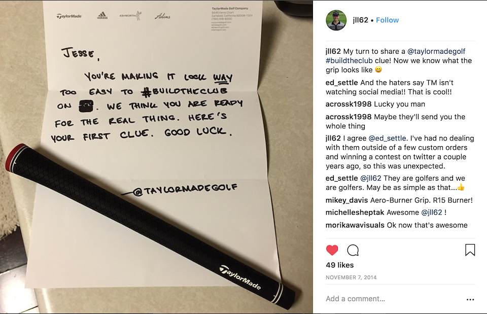Two days into the campaign, we identified a superfan (Instagram user @jll62) who was actively putting the pieces back together under the #buildtheclub. To surprise and reward the fan in a one-of-kind way, we literally started mailing him physical components of the club to build the R15 driver. From the grip to the driver head, he received one component in the mail via FedEx overnight every day for a week with handwritten clues from TaylorMade. A hardcore golfer, he was capable of building the club in his own garage and shared photos and a video during the process. His true reward was getting our newest driver about three months before any other golfer could even buy it.