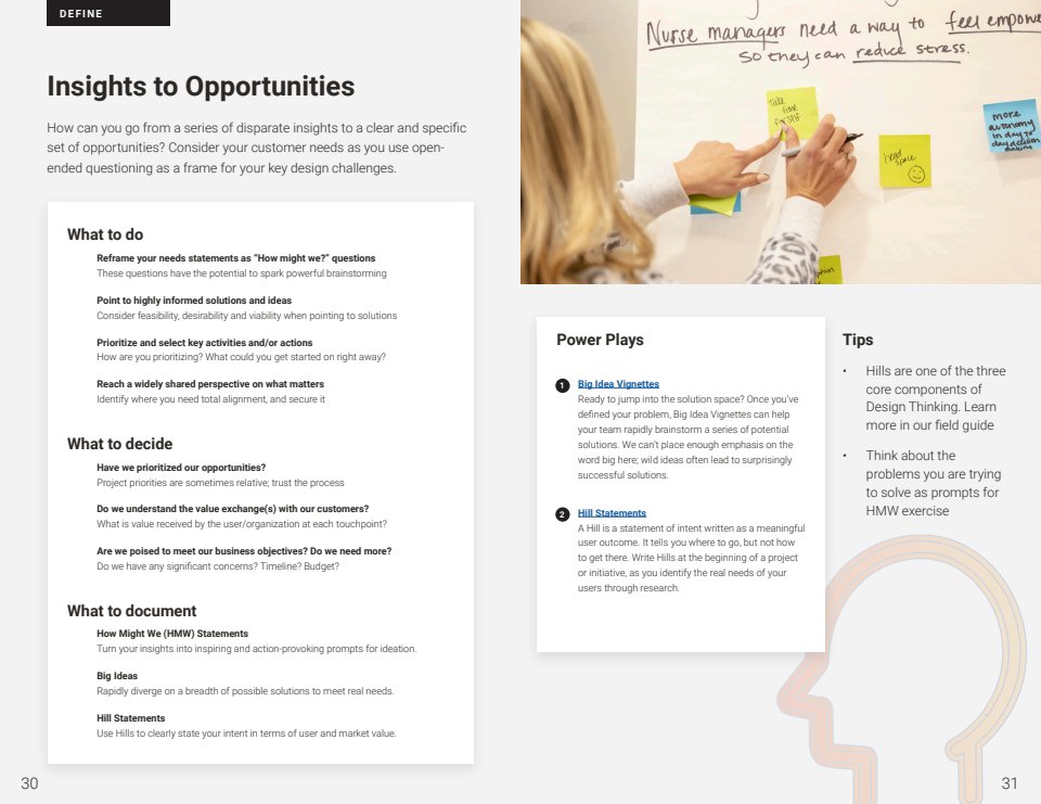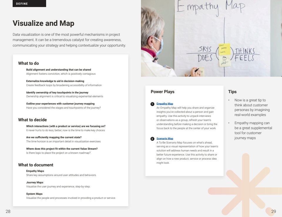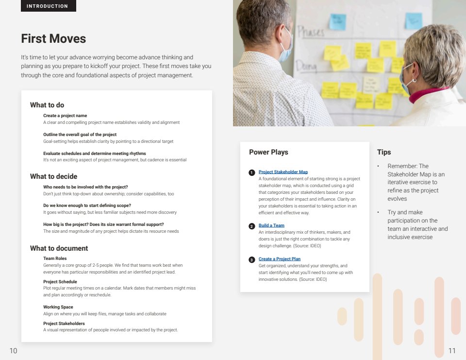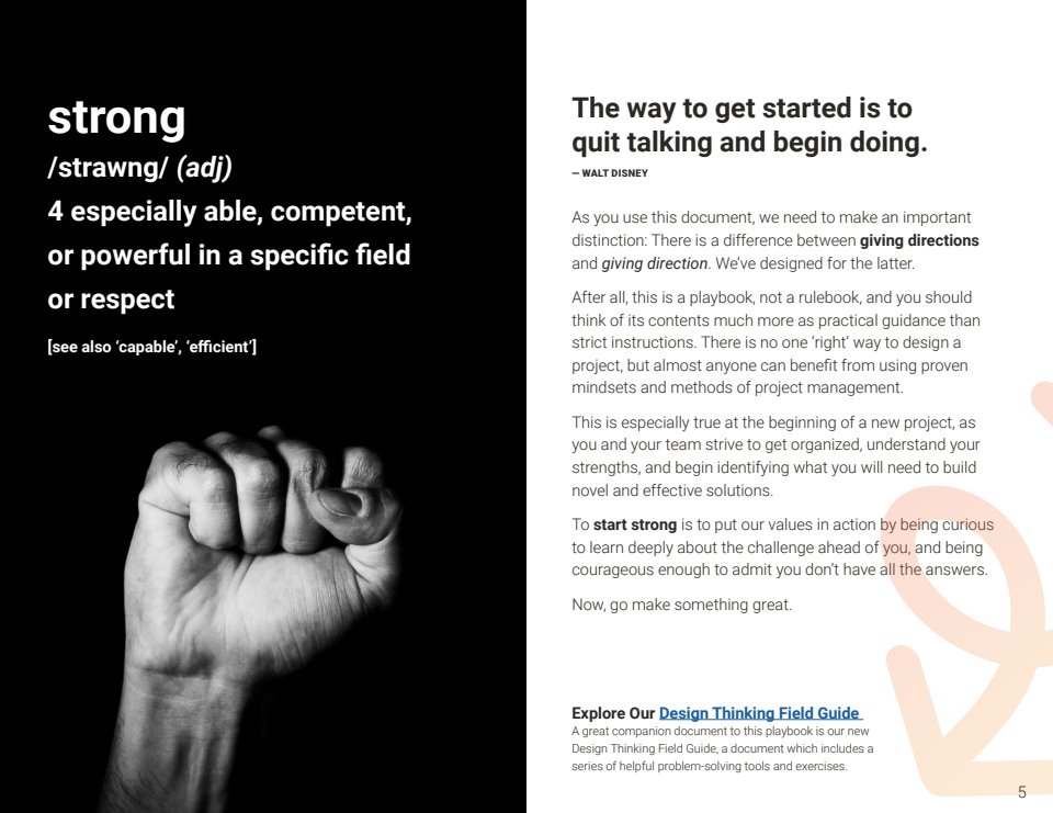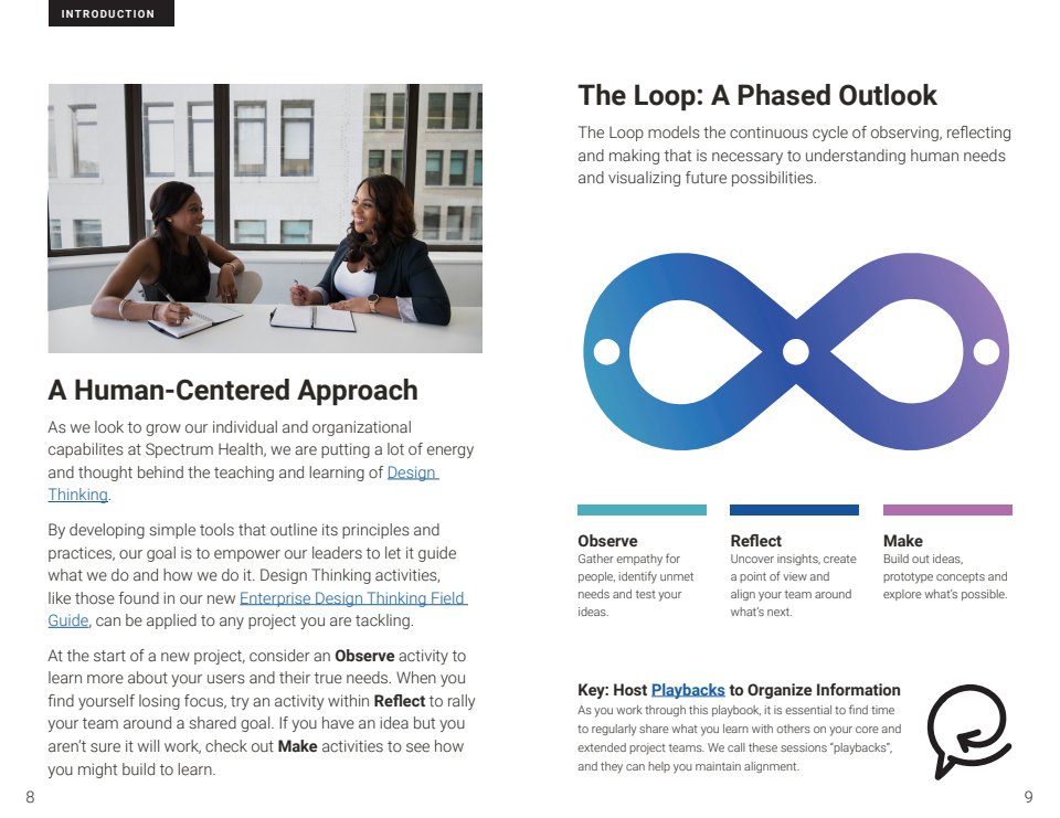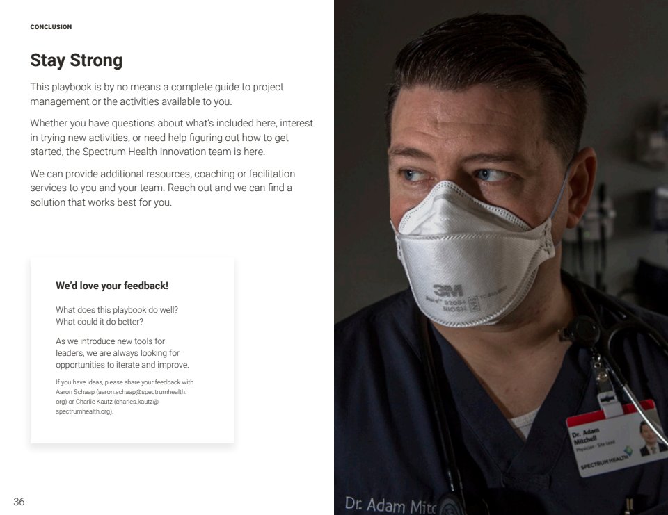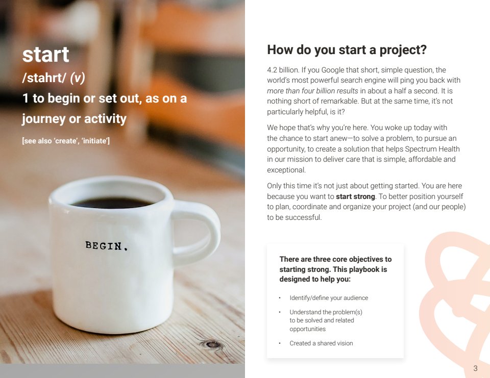 One of our goals at Spectrum Health was to grow organizational capability across three primary skills: change management, project management, and communication. This ‘Start Strong’ project leadership playbook was created to support our leaders and teams with incorporating strategic planning and design thinking into planning and execution processes. I participated in the design and led content creation for this playbook.
